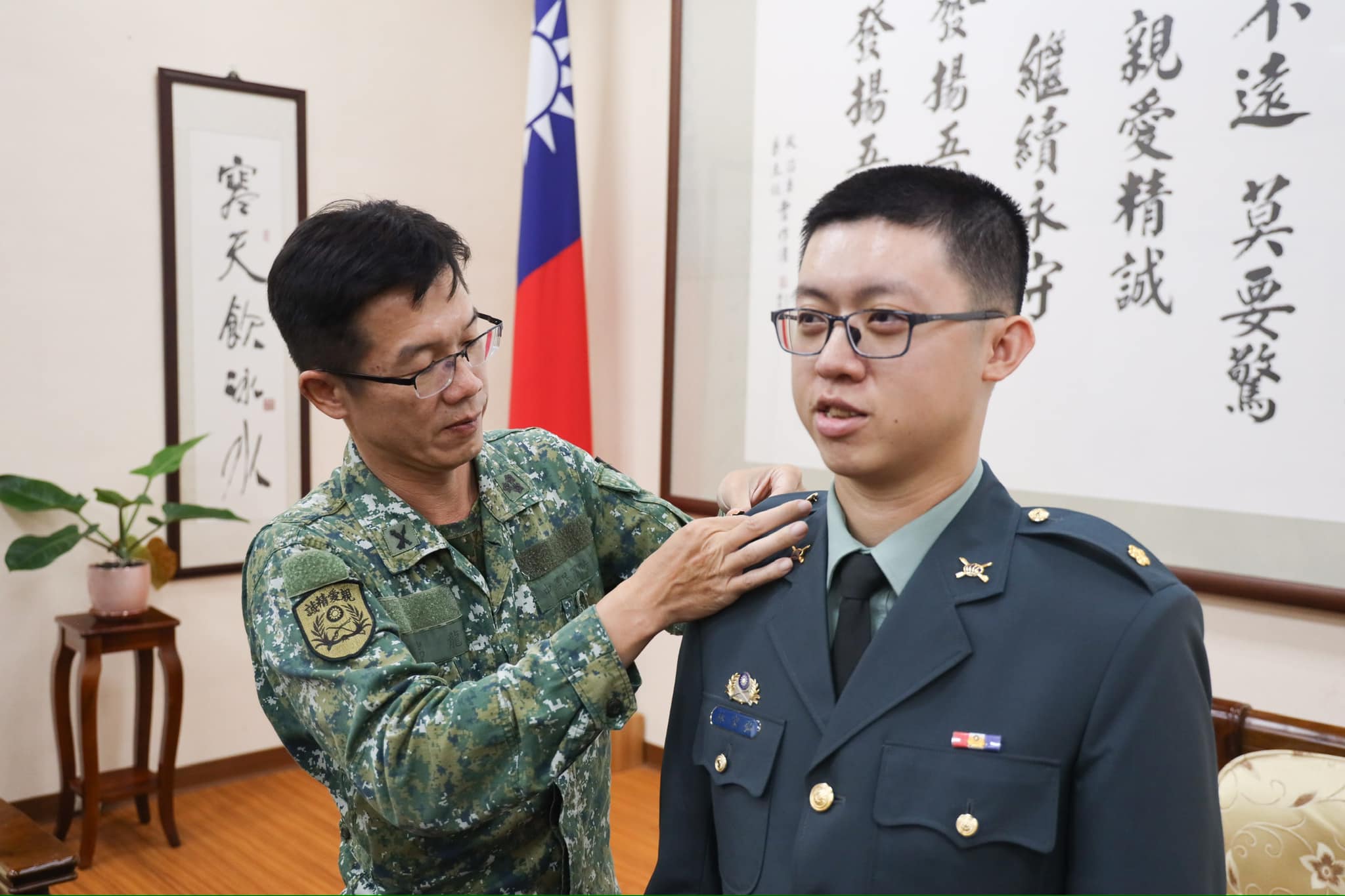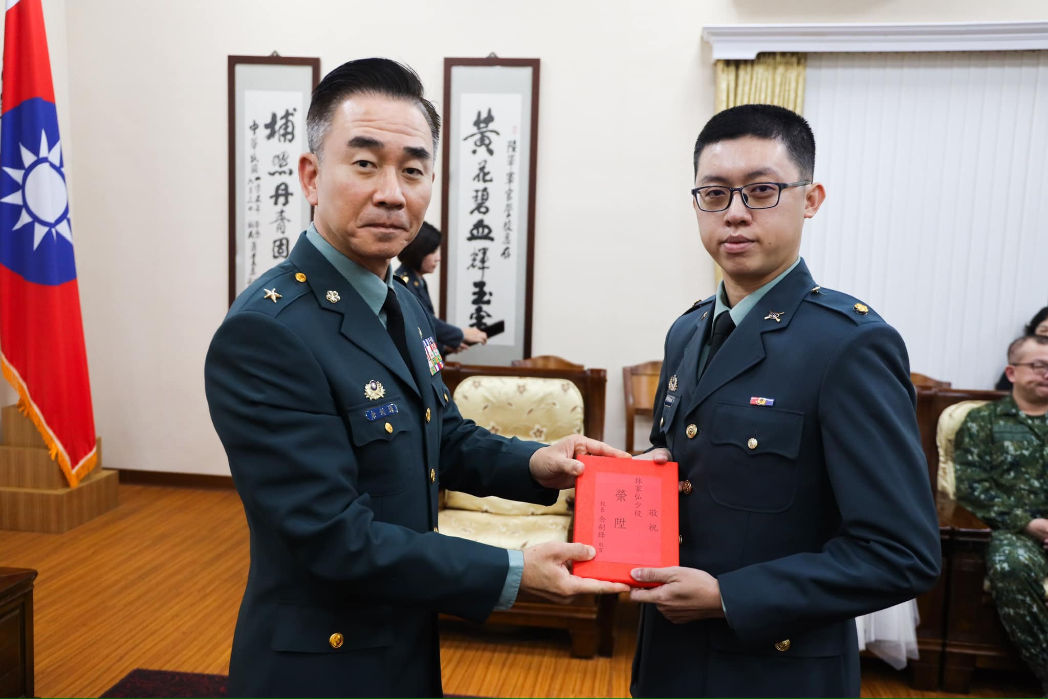 校長余少將於昨(29)日主持「113年8月份晉任授階典禮暨退休人員勗勉」,除為晉任少校林家弘授階,同時也為本校退休雇員王美麗授獎。