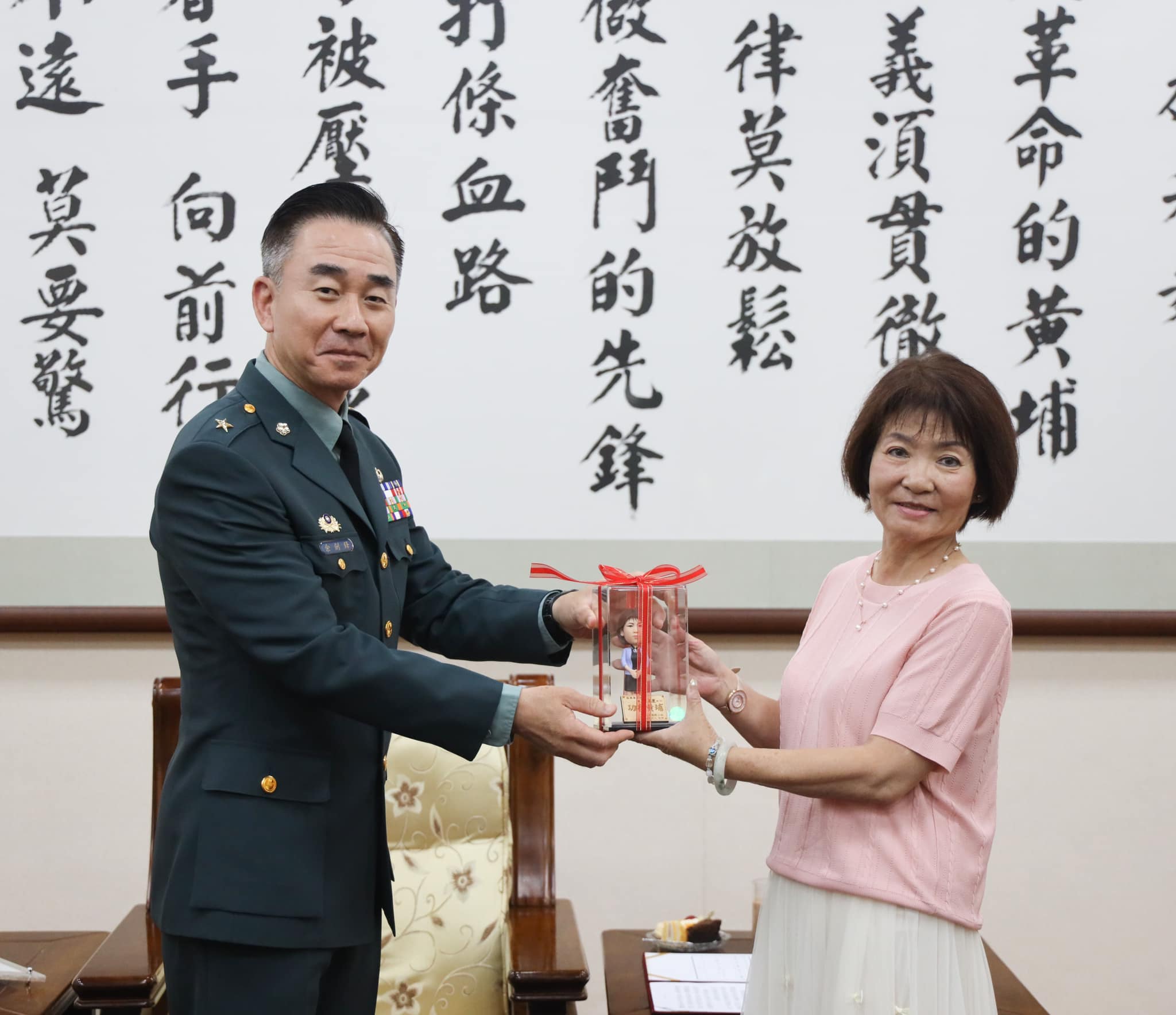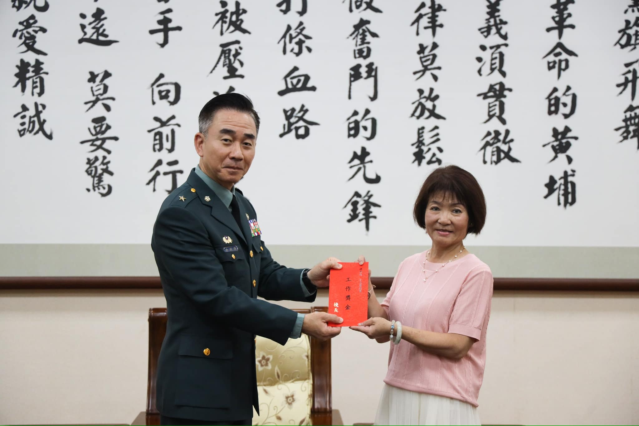 校長勉勵晉升代表各級長官對個人工作上表現的肯定,更是責任的加重,在工作上應持續發揮專業。此外,感謝雇員以高度的責任心及敬業樂群的工作態度,為本校業務推展盡心,對國軍的付出和貢獻深得欽佩,特別頒贈「Q版人像公仔」紀念品,表達最深的感謝之意。