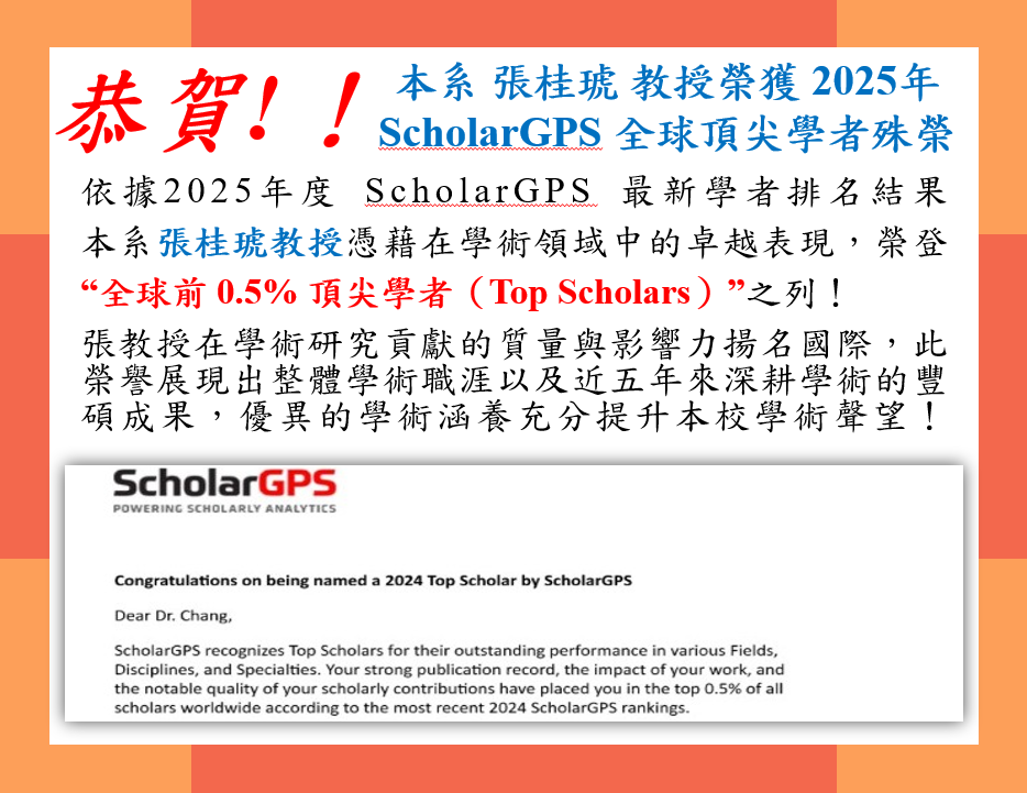 恭賀!!本系 張桂琥 教授,獲選 2024年科學影響力全球前 2% 頂尖科學家暨終身科學影響力全球前 2% 頂尖科學家!