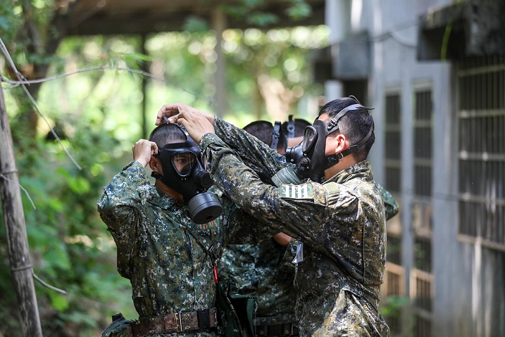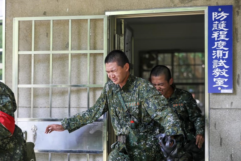 首先由步訓部教官介紹核生化戰場特性及防護裝置等原則講解,並在實作練習中,磨練入伍生在時限內完成防護面具的配戴及密合測試,接續燃燒「CS膠囊」模擬毒氣情境,讓入伍生真實感受到毒氣所帶來的不適與灼熱感,入伍生們無不眼淚、鼻涕、口水直流,接續在教育班長引導下離開毒氣室,入伍生們快速擺動雙手,大步前進,想必這將是入伍訓練中難忘的課程之一,透過本次課程,體驗毒氣威脅的戰場景況,熟練穿戴防護裝具的技能,以維護自身安全。